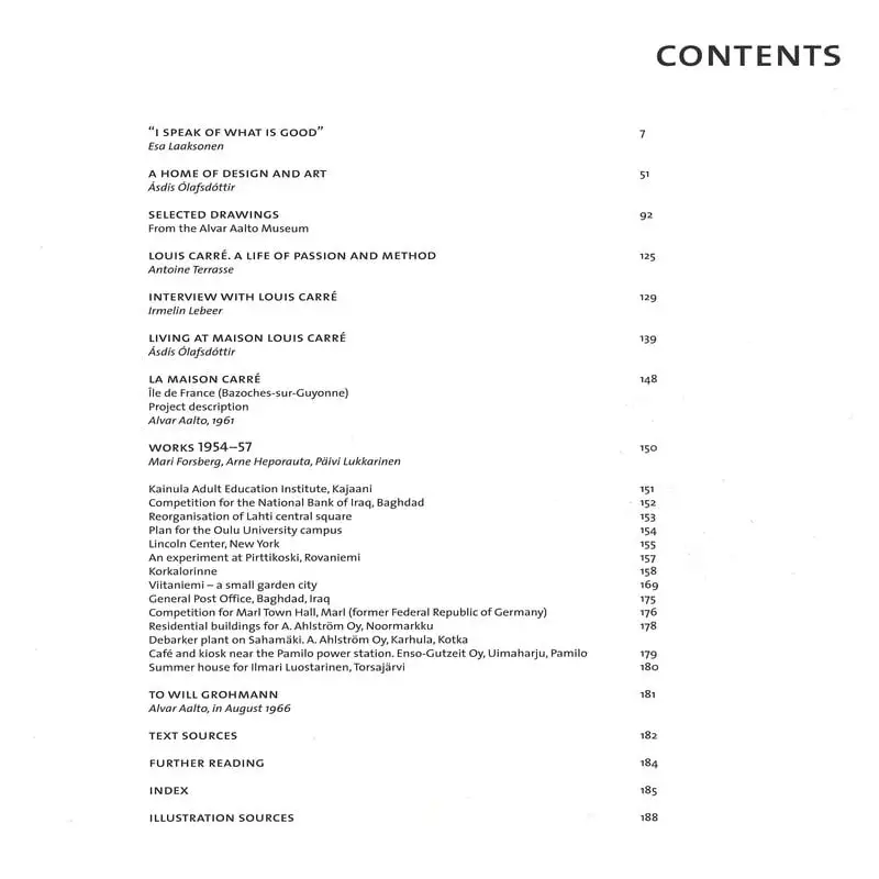 Antoine Terrasse beschreibt das reiche und bewegte Leben von Louis Carré, ergänzt durch ein Interview, das Irmelin Lebeer in den 1960er-Jahren mit dem Kunsthändler führte. Das Buch stellt auch andere Werke vor, die von Aaltos Büro zeitgleich mit dem Design der Maison Louis Carré (1955–57) geschaffen wurden.