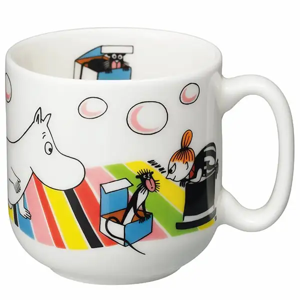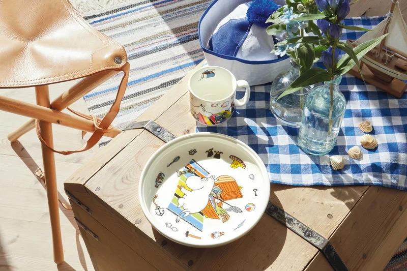 Das Kindergeschirrset Mumintroll von Arabia besteht aus einem kleinen Keramikteller und einem Becher und wurde von Richard Lind entworfen. Die lustige Illustration auf dem Teller zeigt Mumintroll, der Erinnerungsstücke aus den aufregenden Abenteuern von Muminpapa durchstöbert, während die Tasse Mumintroll mit der Kleinen Mü und einem tierischen Freund zeigt. Das entzückende Set ist geeignet für die Spülmaschine, den Gefrierschrank, die Mikrowelle und den Ofen.