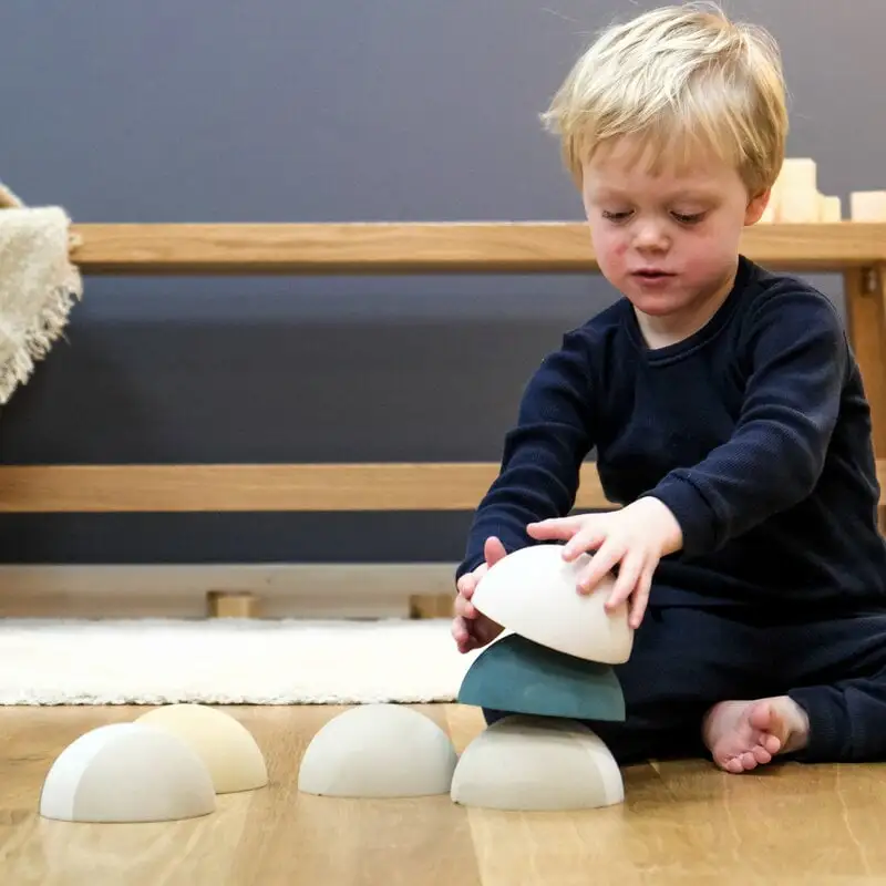 Stepstones von bObles fördern auf spielerische Art und Weise die Koordinationsfähigkeit von Kindern. Das Stepstones-Set enthält sechs halbkreisförmige Spielsteine, die unendlich viele Kombinationsmöglichkeiten für verschiedene Spielvarianten bieten. Die Kinder können die Steine aufeinander stapeln, um einen hohen Turm zu errichten, oder eine abenteuerliche Hüpfstrecke bauen. Durch das Stehen auf einem umgedrehten Halbkreis wird der Gleichgewichtssinn geschult. Die Stepstones sind ideal für kleine Kinderhände, aber auch für Erwachsenenfüße: Die weiche Wölbung der Trittsteine bietet eine angenehme Massage für müde Füße nach einem langen Tag.