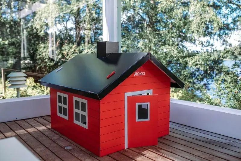 Hergestellt aus rot getöntem Kraftliner mit Siebdrucktechnik ist das mobile Spielhaus ökologisch und leicht, aber dennoch zum Spielen stabil genug. Das Öko-Spielhaus wird als Gemeinschaftsprojekt zwischen Futupack, Capertum und Metsä Board produziert.