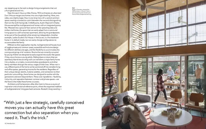 Come Together: Architecture of Multigenerational Living, erschienen bei Gestalten, gibt einen interessanten Einblick in eine alte, heute weniger verbreitete Form gemeinschaftlichen Wohnens. Das Buch stellt verschiedene Mehrgenerationenhäuser vor und untersucht die Möglichkeiten moderner Architektur, harmonische, für beide Seiten vorteilhafte Formen des Mehrgenerationenlebens zu schaffen. Das Buch wurde von Joann Plockova herausgegeben, einer auf Mehrgenerationenhäuser spezialisierten Designjournalistin, die für Druckwerke wie die New York Times, Monocle und Azure schreibt.