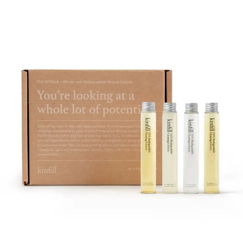 Die Idee hinter den selbst gemischten Konzentraten und den Glasflaschen von Kinfill ist die Reduzierung der Menge an Plastikmüll. Dieselben Flaschen können immer wieder verwendet werden: Füllen Sie die Konzentrate in die Flaschen, füllen Sie sie mit Wasser auf und schwenken Sie sie vorsichtig. Wenn Sie das gesamte Reinigungsprodukt verbraucht haben, wiederholen Sie die Schritte! Starterkits und Nachfüllpackungen sind separat erhältlich, so dass Sie weiterhin dieselben Glasflaschen verwenden und später nur weitere Konzentrate nachkaufen können. Die umweltfreundlichen, biologisch abbaubaren Reinigungsprodukte bestehen aus reinen, aber wirksamen Inhaltsstoffen, die keine Chemikalien enthalten, die für Sie oder die Umwelt schädlich sein könnten.