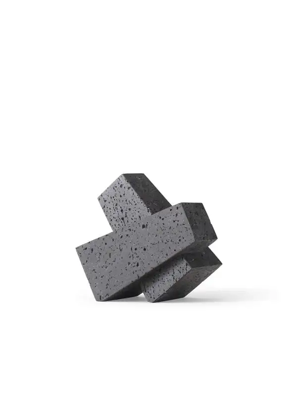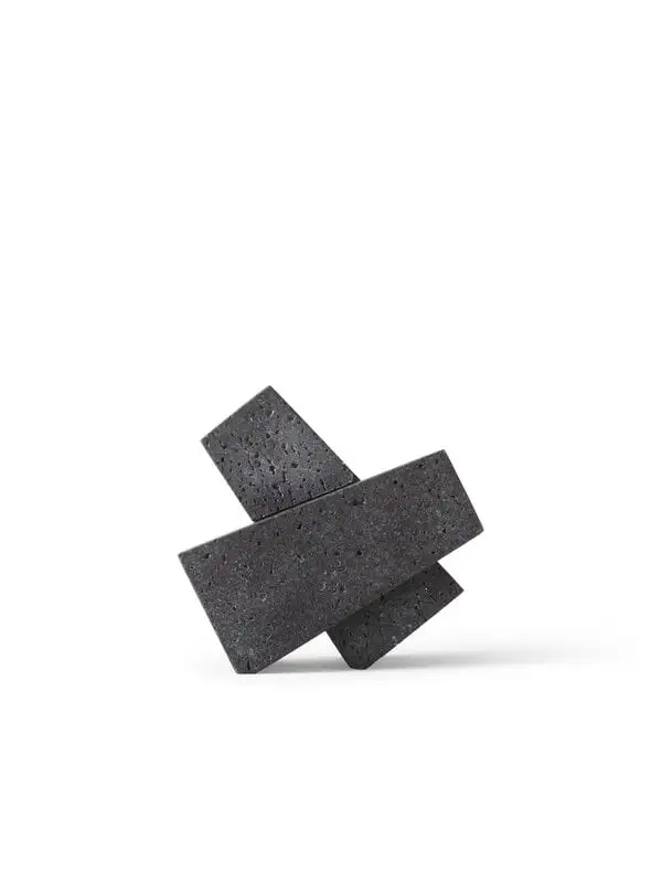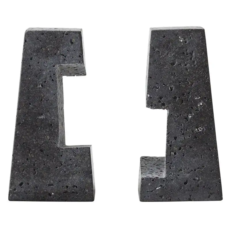 Die Converge-Buchstütze von Menu besteht aus Lavastein mit einer dunklen, unregelmäßigen Oberfläche, die dem wunderschönen Ornament eine einzigartige Textur verleiht. Die Buchstütze besteht aus zwei abstrakten Teilen, die in ihrer ursprünglichen Funktion verwendet werden können, um die Bücher im Regal in geraden Reihen zu halten, oder sie können zusammengefügt werden, um eine originelle Skulptur für den Couchtisch, ein Regal oder eine Fensterbank zu schaffen.