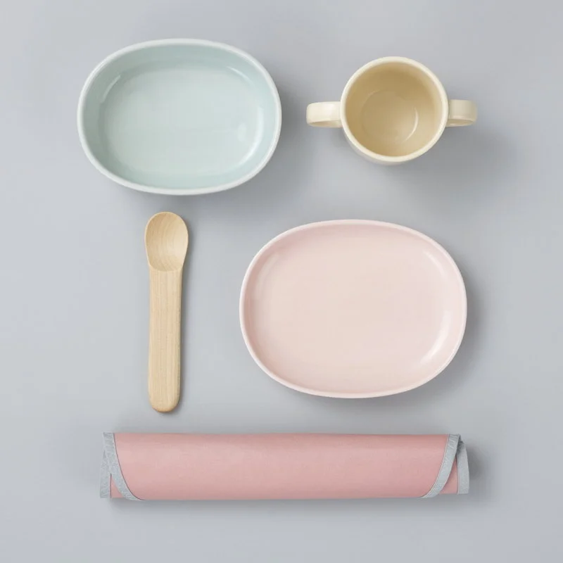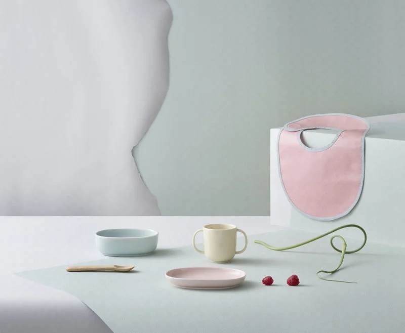 Geschirr: Keramik, Löffel: Ahorn, Lätzchen: PVC-Baumwolle-Gewebe